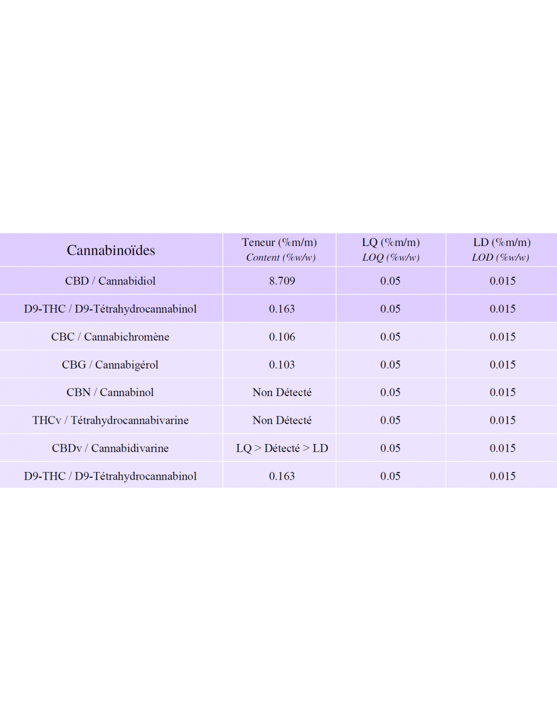 | Cannabinoïdes | Teneur (%m/m) | LQ (%m/m) | LD (%m/m) |