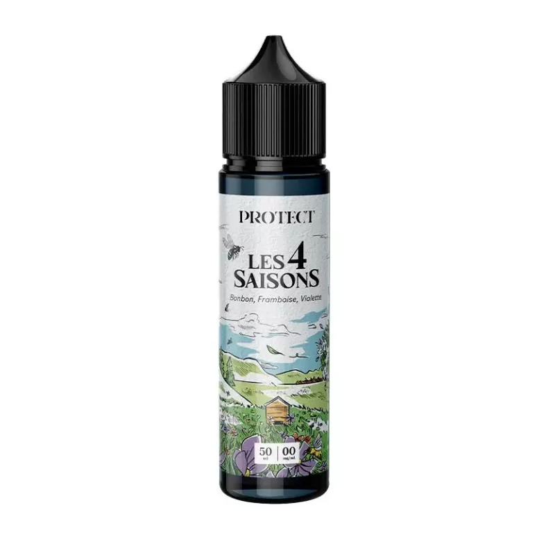 E liquide Les 4 Saisons Protect 50 ml, proposé en 40/60 de MPGV/VG et 0 mg de nicotine en 50 ml dans un flacon pouvant contenir 75 ml.